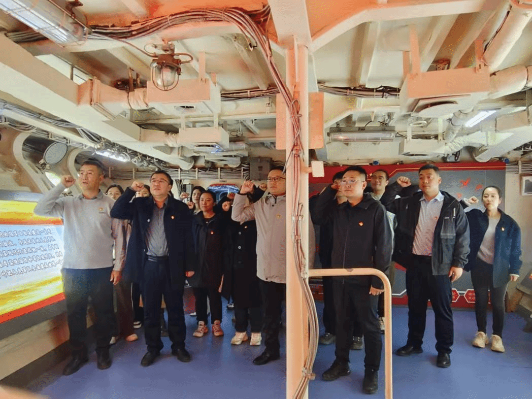在讲解员的带领下,师生党员们学习感受丹东舰曾经的光辉航程,也深深感悟到了“不怕苦、不怕累,特别能战斗”的丹东舰精神。在船舱中的党员学习室,副校长王东带领全体党员重温了入党誓词。铿锵有力的铮铮誓言,表达了身为党员的责任和担当,激发着团结奋进的精神力量。