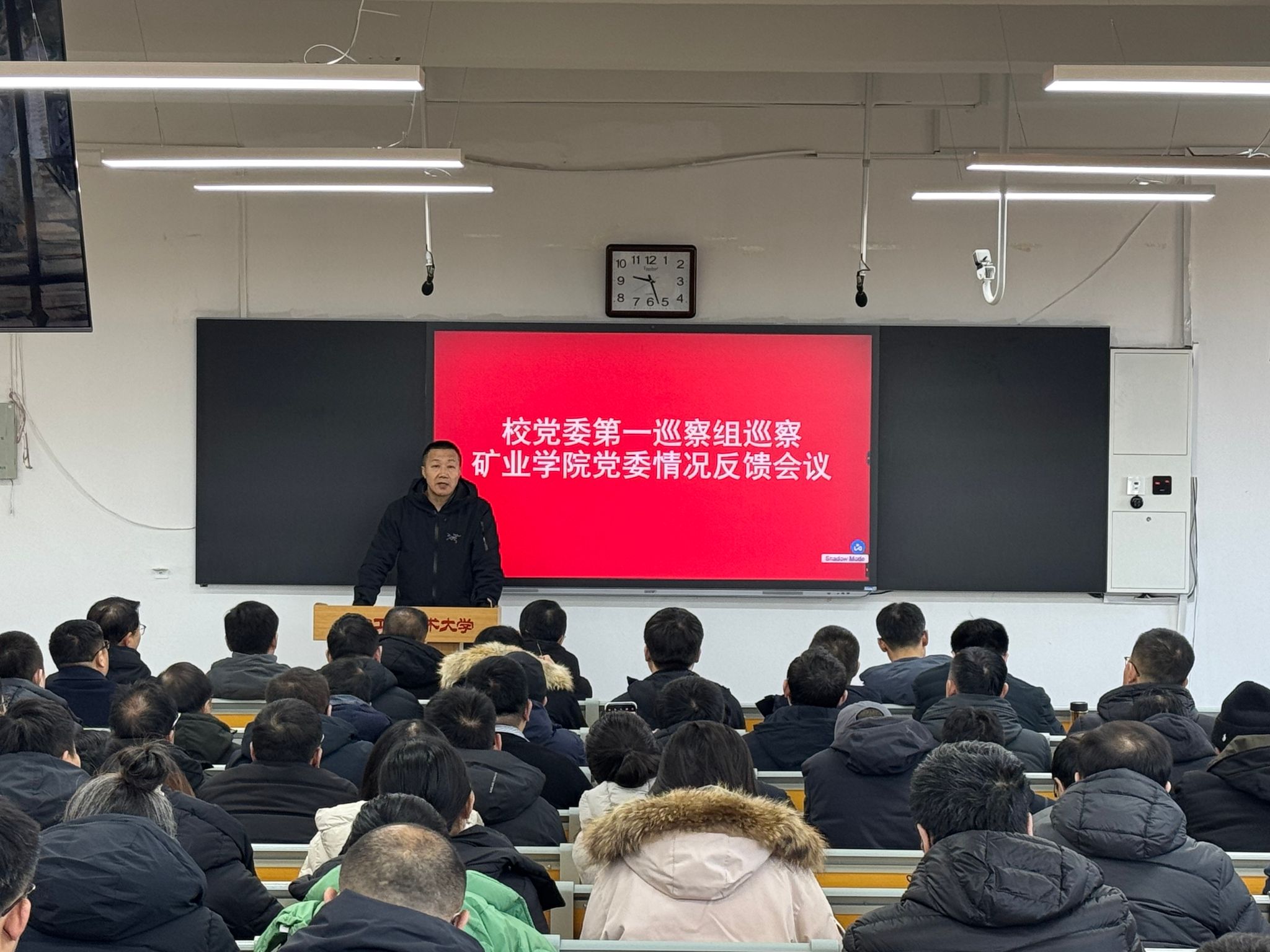 根据校党委巡察工作领导小组的部署,2025年12月25日,校党委第一巡察组向矿业学院党委反馈了巡察情况。校党委第一巡察组副组长熊善勇向矿业学院党委领导班子进行了反馈,校党委巡察工作领导小组办公室主任寇玉生向矿业学院党委传达了校党委和校党委巡察工作领导小组关于巡察整改的要求。于海军同志主持会议并作表态发言。