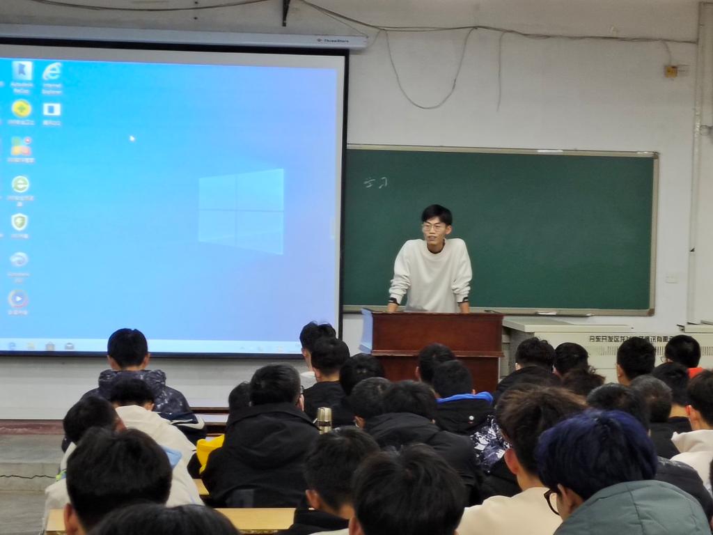 首先,邢景超学长面向大一新生进行了简单的自我介绍,并着重介绍了他所获的各项荣誉,国家级荣誉九项,省级荣誉13项,授权国家级专利五项,发明专利一项,发表论文六篇,校级荣誉34项。通过分享自己的亲身经历,希望新生多多关注并参与各类创新创业大赛及科技竞赛,在比赛中提升创新创业能力,在学习中进步。