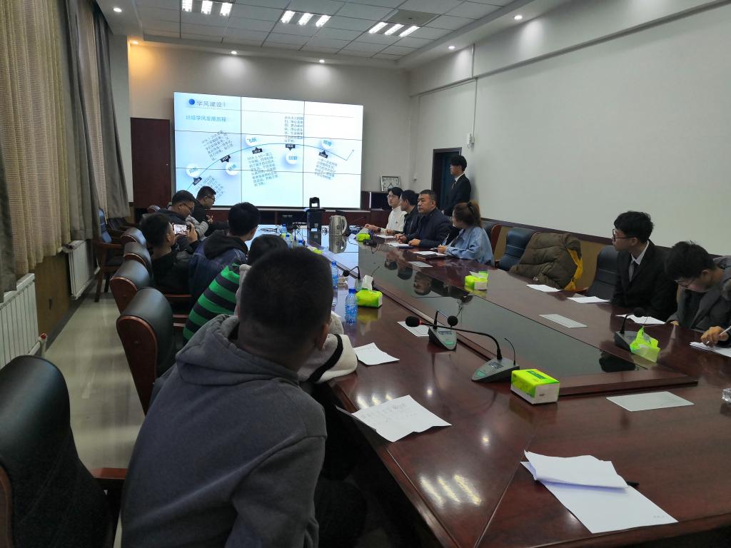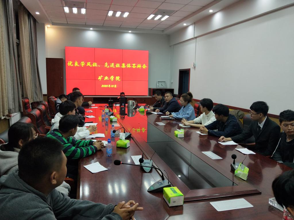 2020年10月23日,矿业学院在学院会议室举办了优良学风班、先进班集体答辩会。出席本次答辩的老师有矿业学院党委副书记聂仁东、学工办主任周玉祥和团委书记丁丁。学院共17个班级参与答辩,各班级认真准备,精心制作了PPT,按抽签顺序进行答辩,分别从班级建设、取得荣誉、帮扶措施等方面进行了汇报。学院核心学生干部和老师分别给予打分,最后评出了3个优良学风班和4个先进班集体。