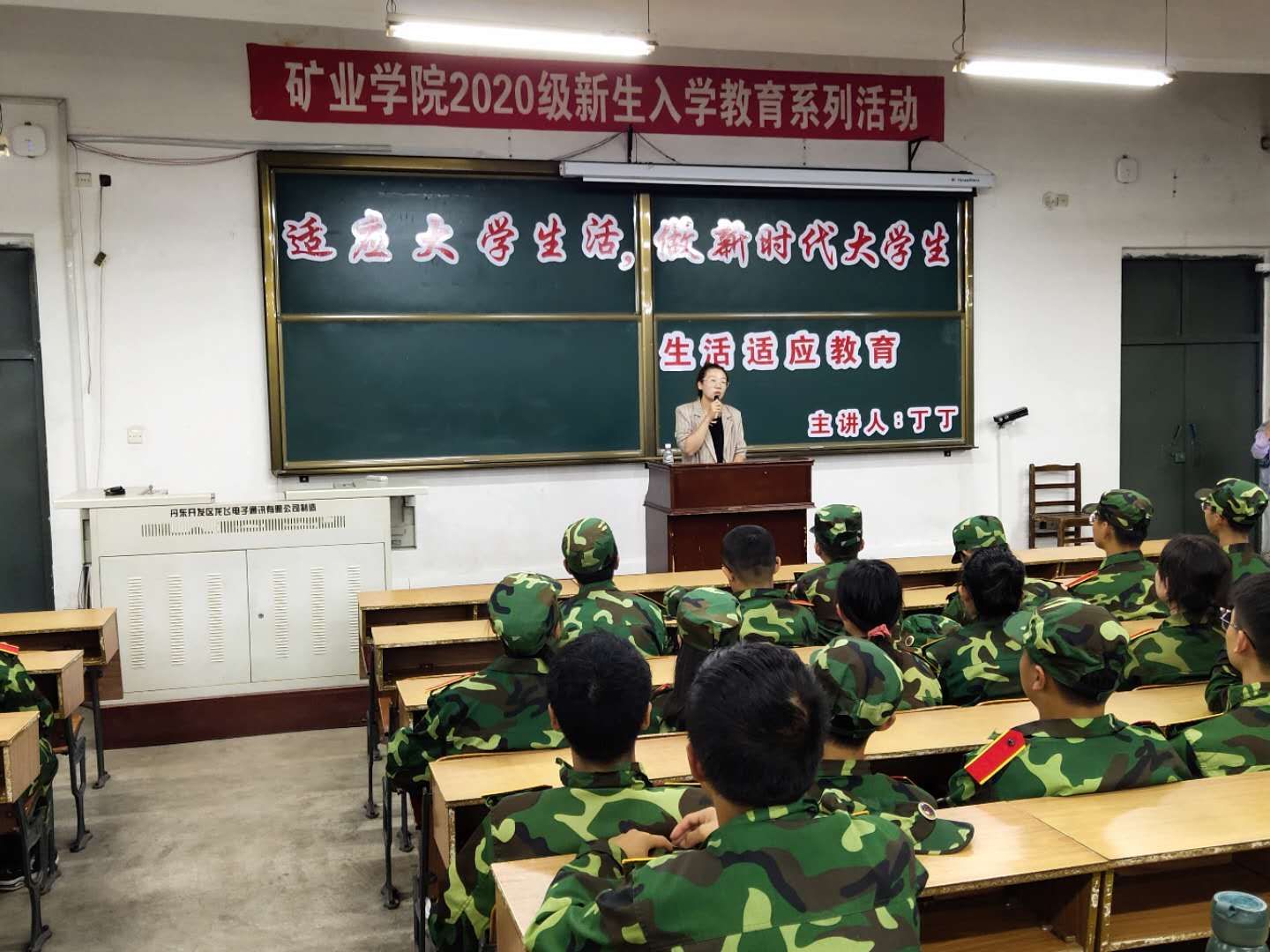 2020年9月23日19时,矿业学院在新华楼402开展2020级新生入学教育系列活动,第一讲是以“适应大学生活,做新时代大学生”为主题的生活适应教育,主讲人是矿业学院团委书记丁丁老师,全体2020级新生参加本次讲座。